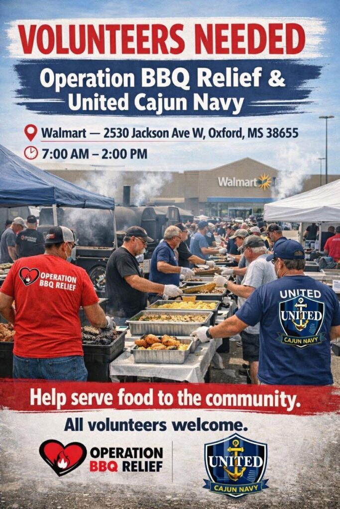 We’ve had so many people reach out wanting to help with the relief efforts in our beloved Oxford community. Right now, volunteers are needed to join the Cajun Navy and Operation BBQ Relief in serving meals. If you’re interested in lending a hand, please check out the details below! #OxfordStrong