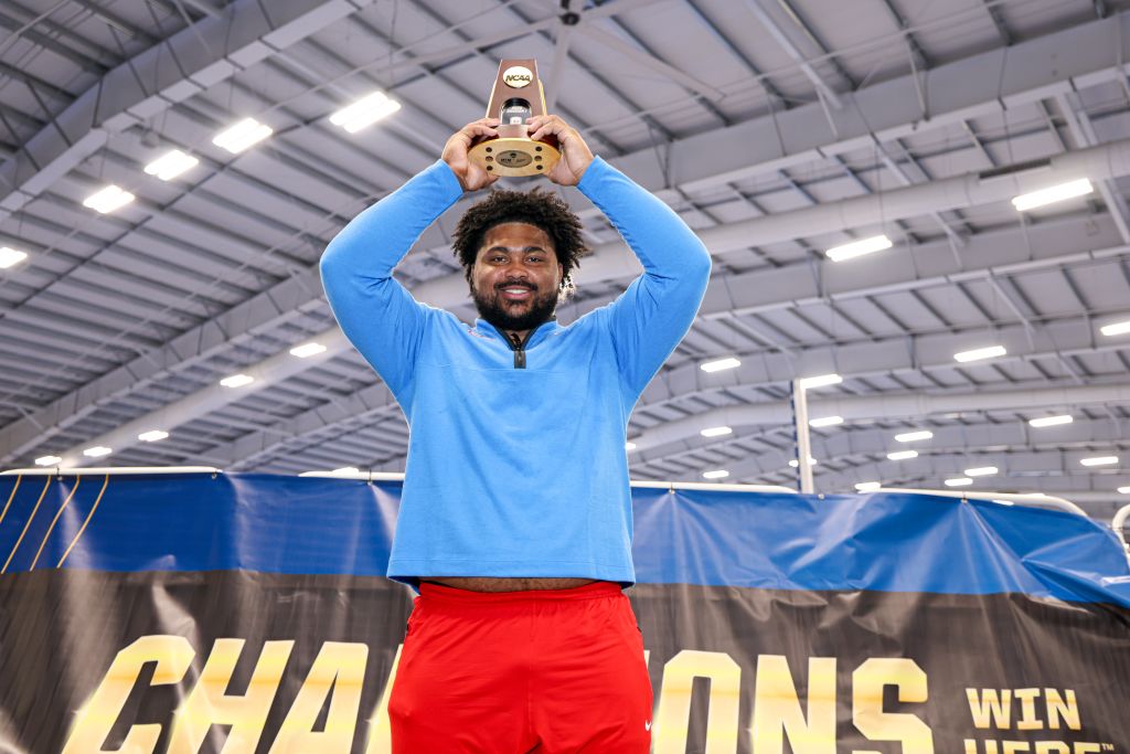 VIRGINIA BEACH, VIRGINIA – MARCH 15: Tarik Robinson-O’Hagan of Ole Miss Rebels celebrates after winning the Men’s Shot Put finals on day two of the Men’s and Women’s Indoor Track and Field Championship held at the Virginia Beach Sports Center on March 15, 2025 in Virginia Beach, Virginia. (Photo by Scott Taetsch/NCAA Photos via Getty Images)